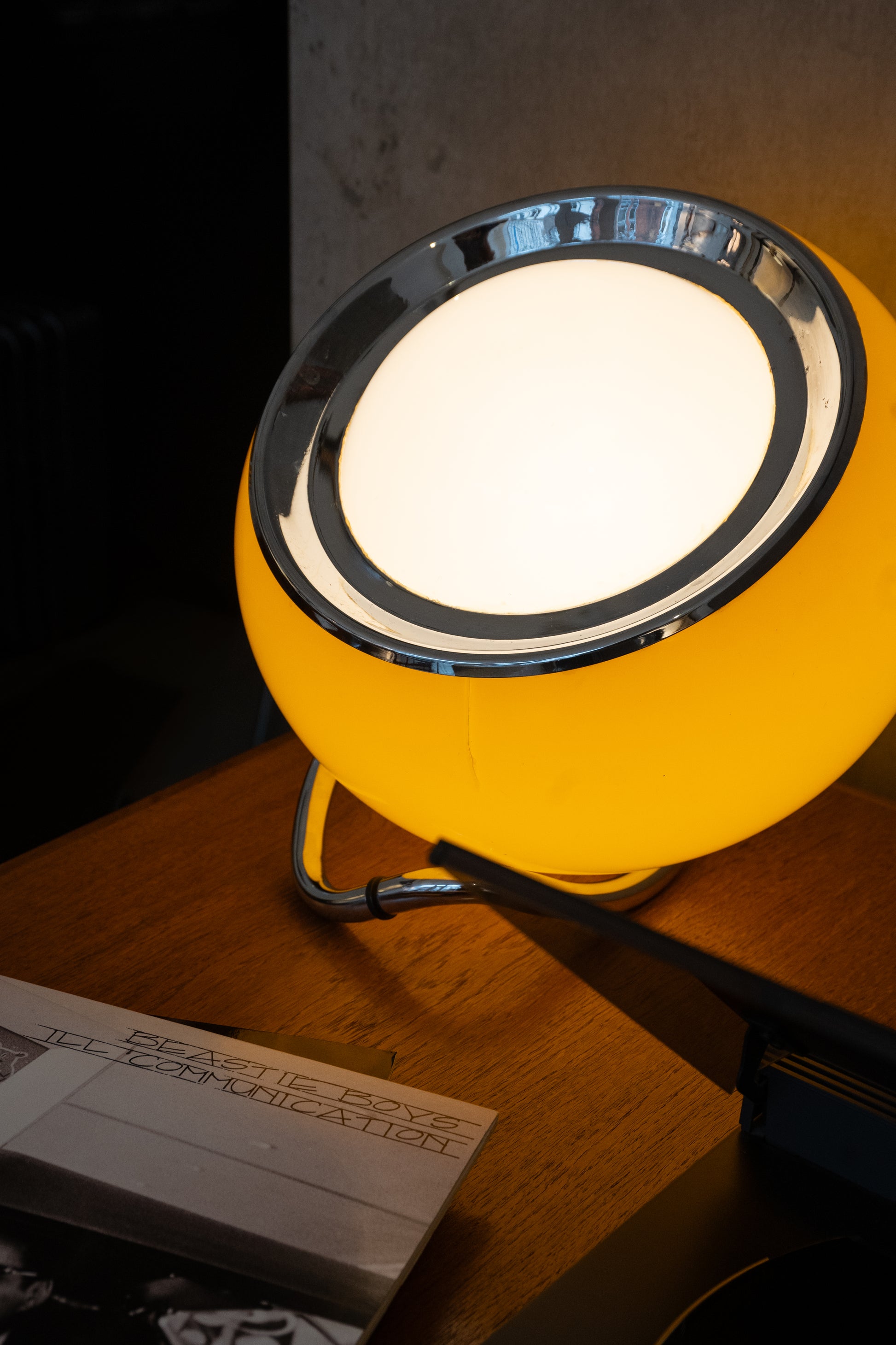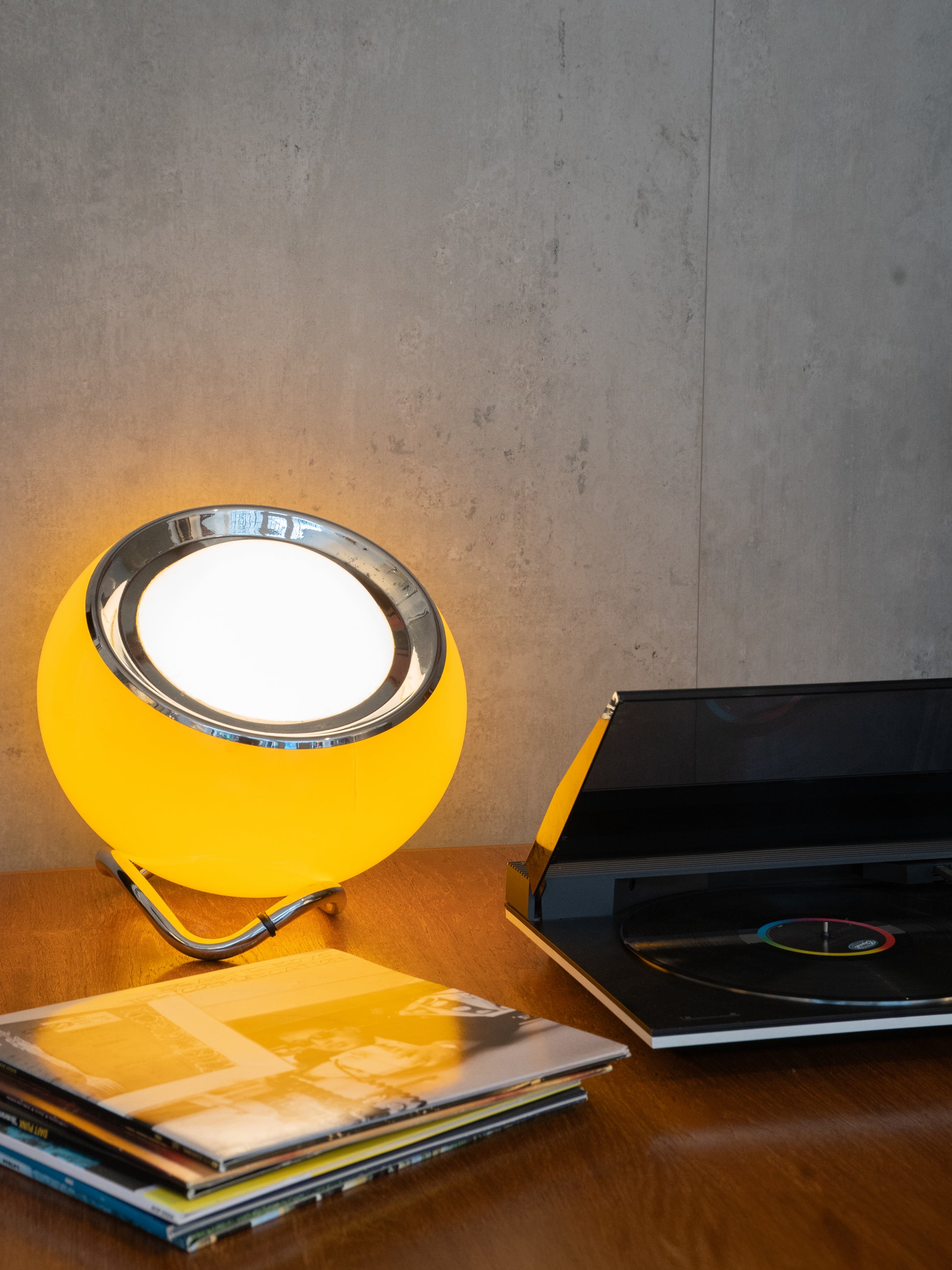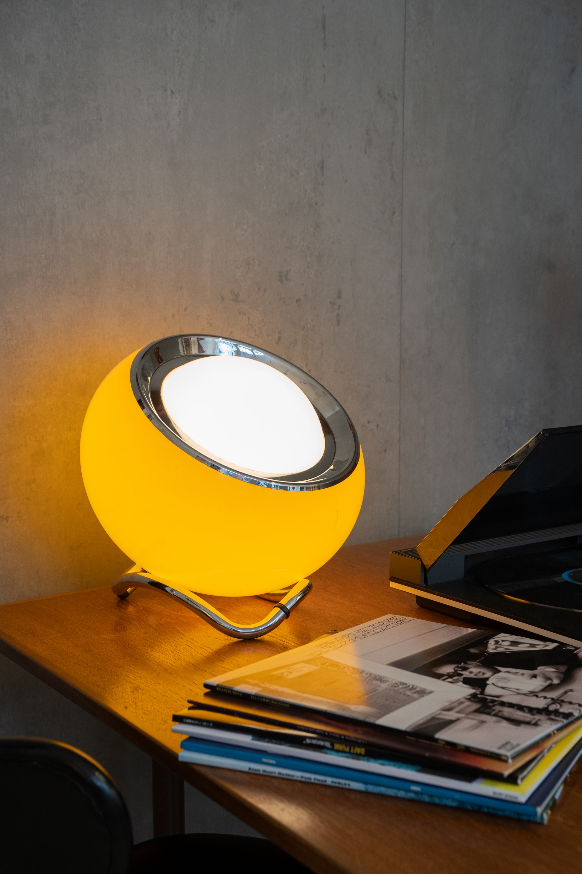 A space age floor lamp, circa 1970 in yellow acrylic with chrome fitting and stand by Harvey Guzzini for Italian 6G Studio Clan.