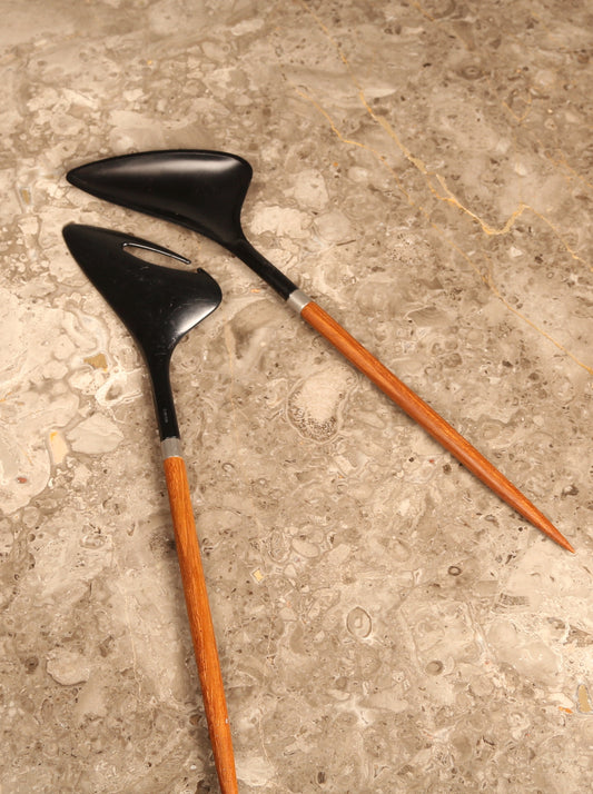 A pair of Danish salad servers in teak and black plastic designed by Helge Bezi, Denmark (1960s)