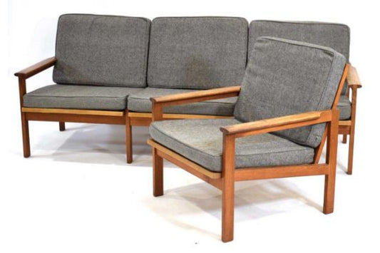 llum Wikkelso for Niels Eilersen, a 1960's teak three-seater 'Capella' sofa and armchair