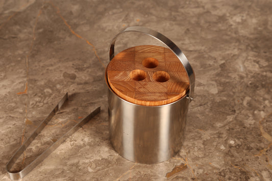 Arne Jacobsen for Stelton, a stainless steel 1960s ice bucket and tongs with teak lid (1960s) Denmark
