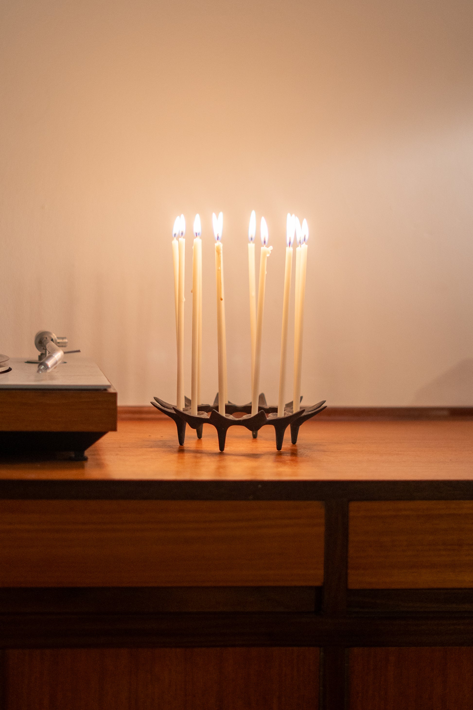 Formed as a circular arrangement of individual candle cups raised on slender feet, the design balances weight and lightness beautifully. The organic, almost crown-like silhouette is typical of Quistgaard’s approach: practical objects with strong sculptural presence. Cast iron was a material he used frequently for its durability and tactile, honest character.