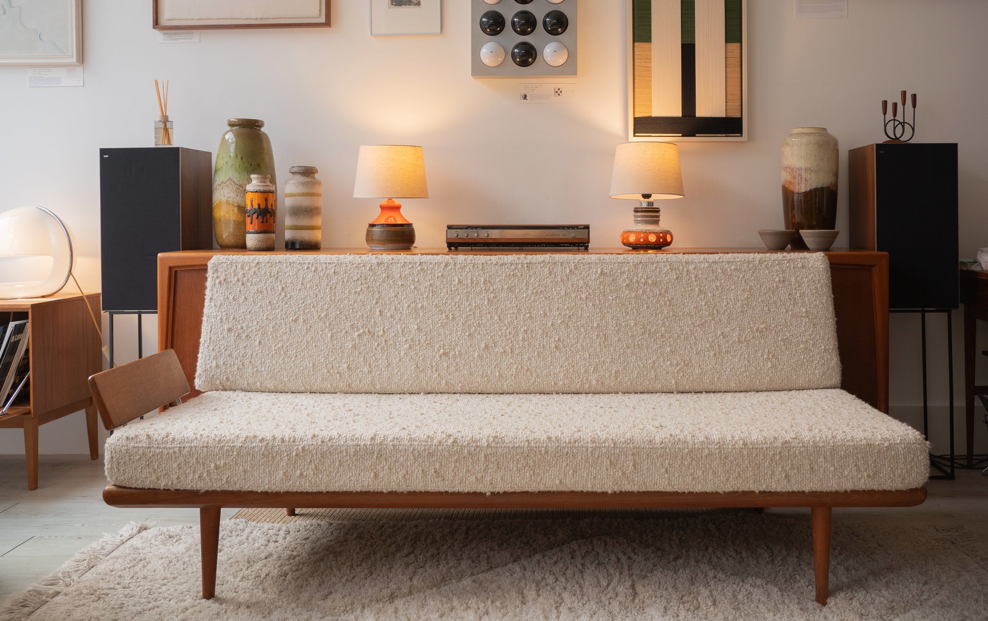 The cushions are new and have been professionally upholstered in a thick luxury boucle named Foam (in Flax colour way) by Kirkby.