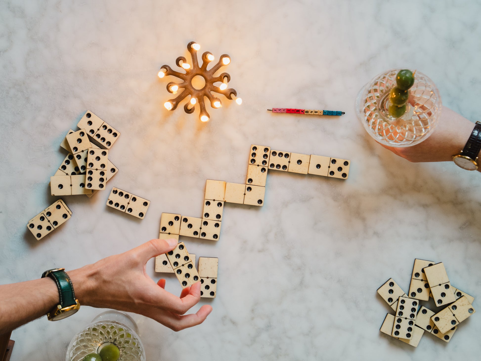 The set includes 28 dominoes, each crafted from bone with inset ebony pips - a traditional method used throughout the 19th and early 20th centuries. Alongside the tiles is a charming row of coloured scoring counters, adding a small but delightful detail to the box interior.