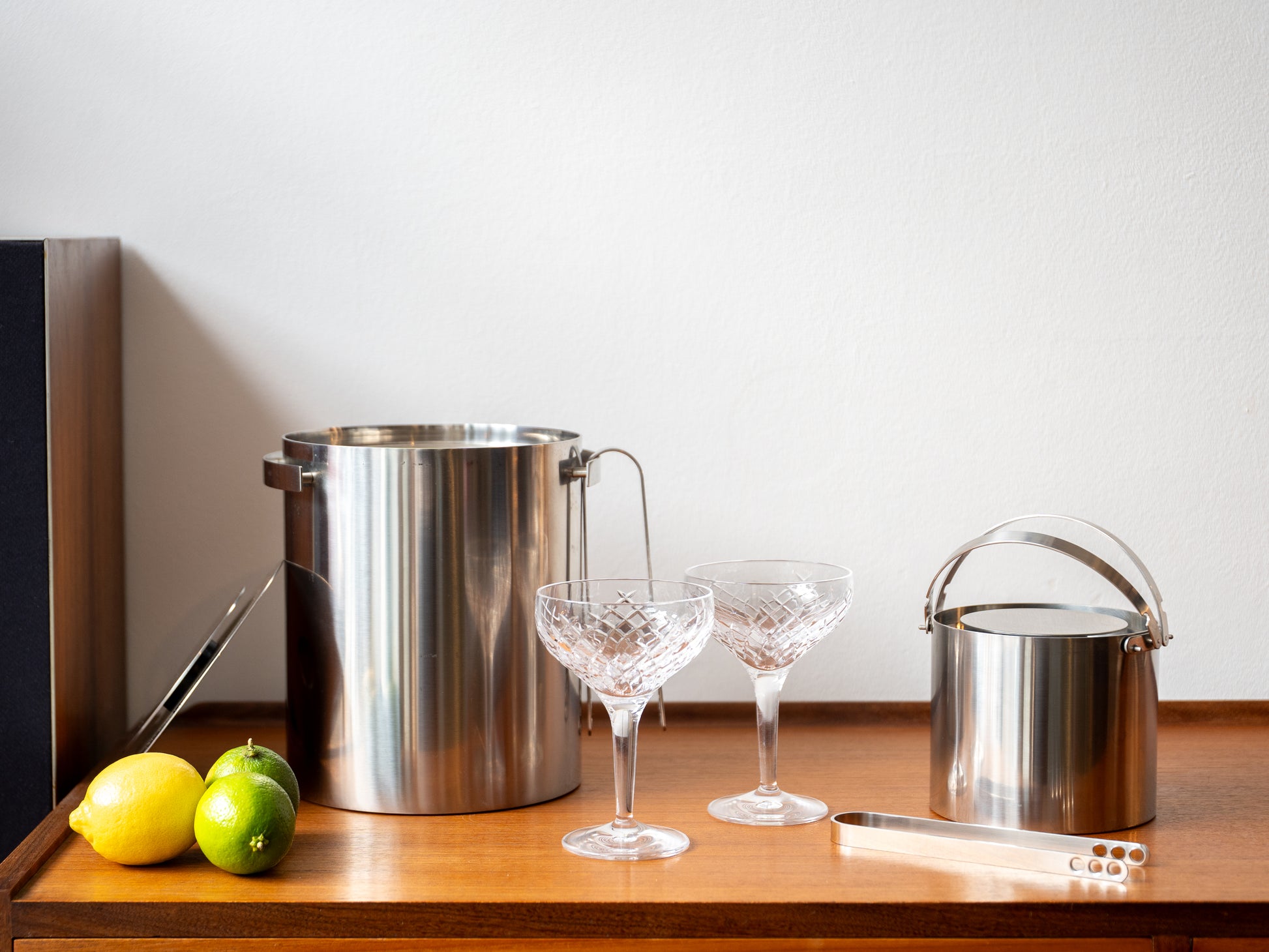 A striking extra-large stainless-steel ice bucket designed by Arne Jacobsen for Stelton, part of the iconic Cylinda-Line series. At 21cm tall and 17cm in diameter, this is the largest format produced.