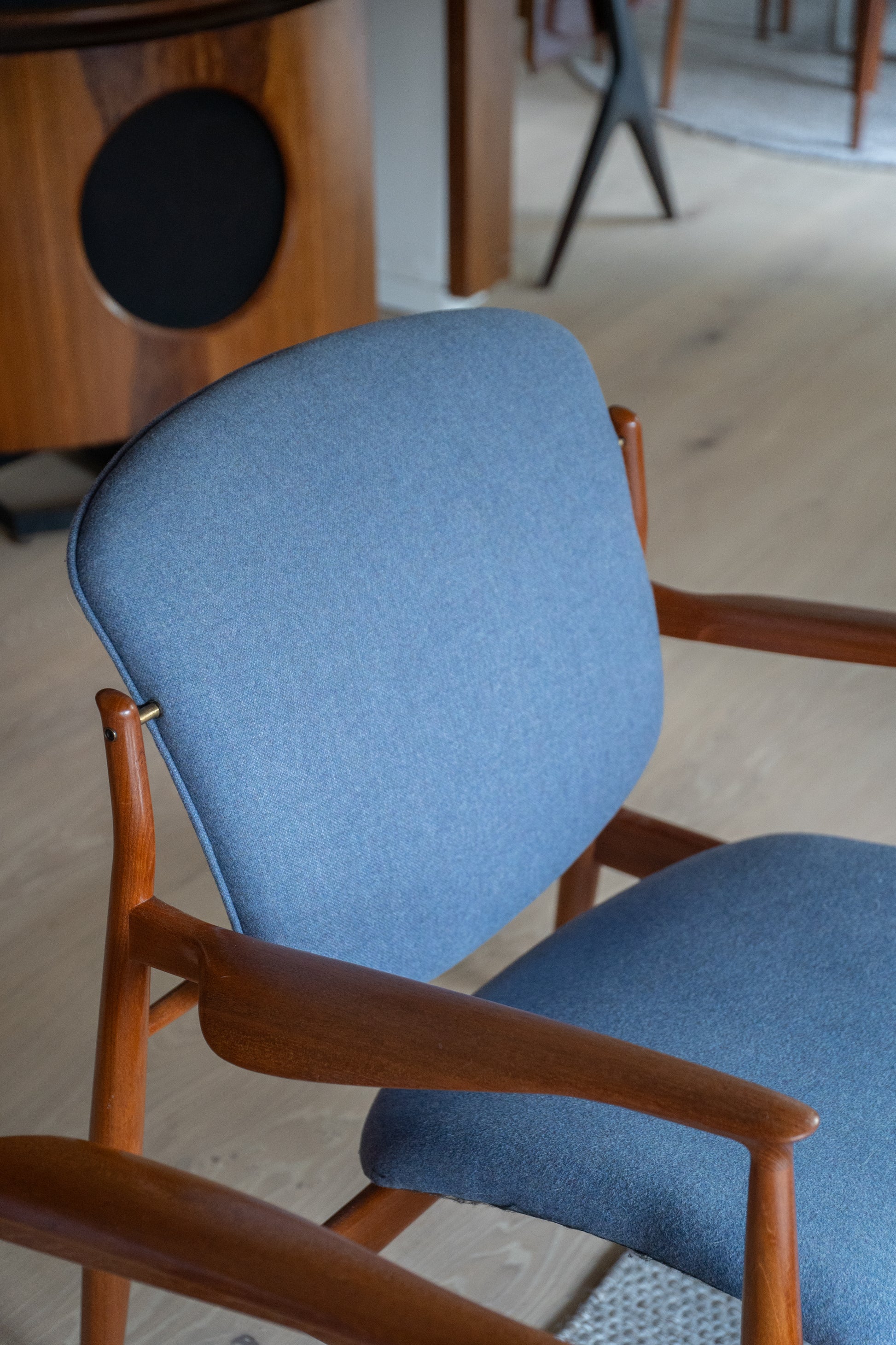 Both chairs have been fully restored with new foam and upholstery while retaining the original internal metal spring system that gives the Model 136 its distinctive level of comfort. They’re finished in a blue-purple 100% wool fabric by Danish Art Weaving, a soft, tonal colour that photographs beautifully.