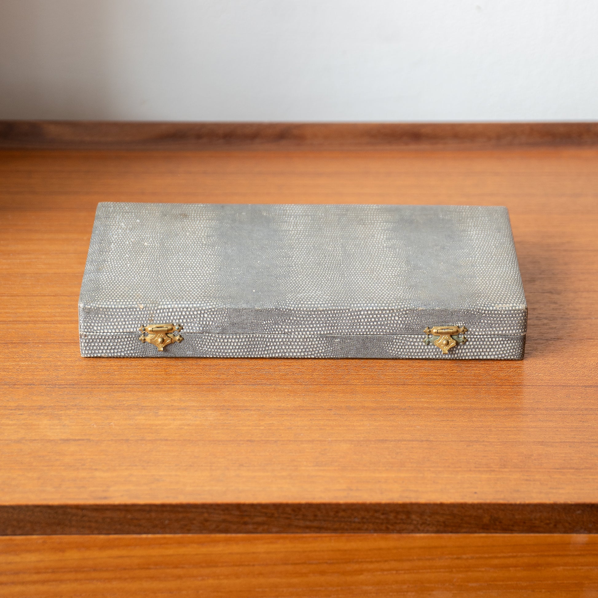 A beautifully kept pair of mid-century salad servers by Vulcan, presented in their original silk-lined box. Dating from the 1950s, the set combines faceted silver-plated handles with translucent horn ends - a popular material of the period for its durability, lightweight feel and warm, elegant appearance.