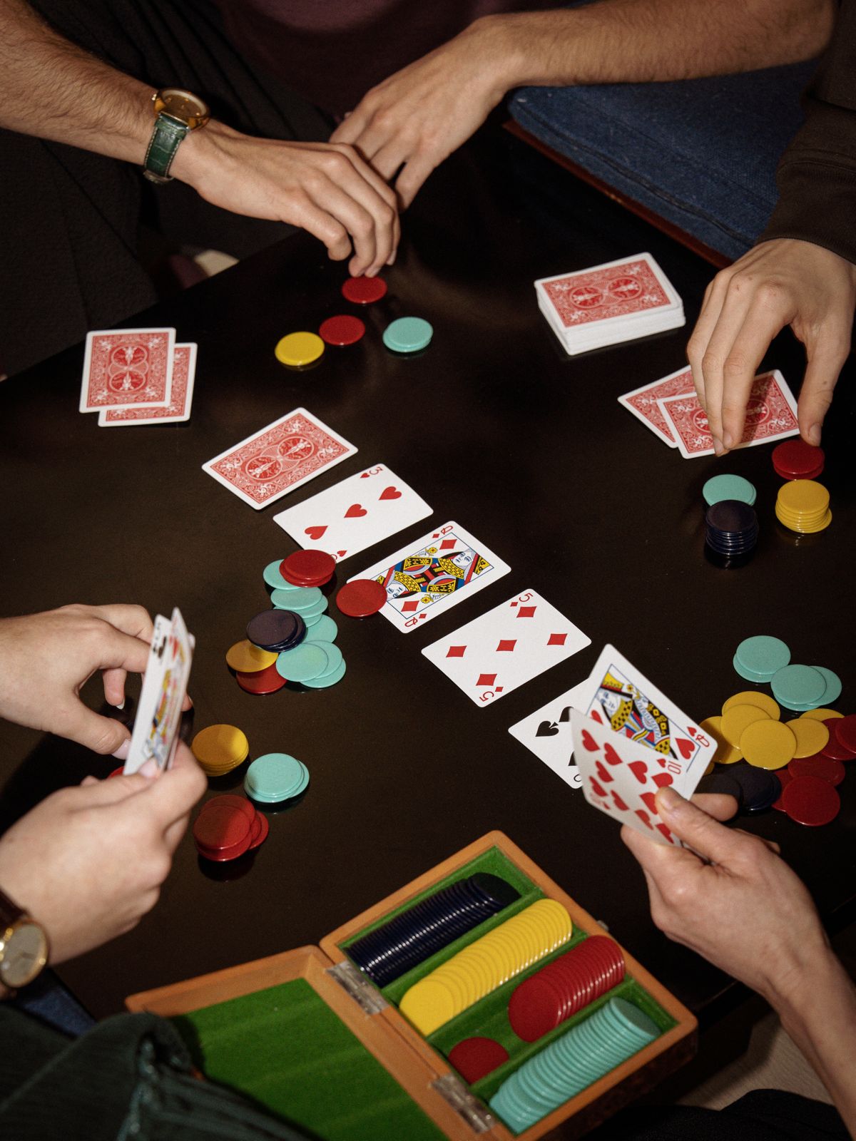 Inside, four neatly arranged rows hold coloured gaming tokens, each 3.2 cm in diameter. The combination of red, yellow, green and deep blue brings a satisfying, graphic quality to the interior — a reminder of the elegance and ritual of traditional games.